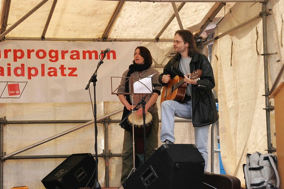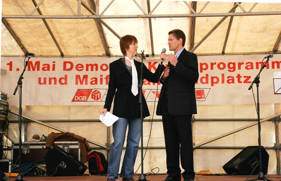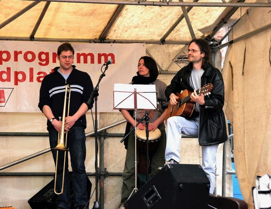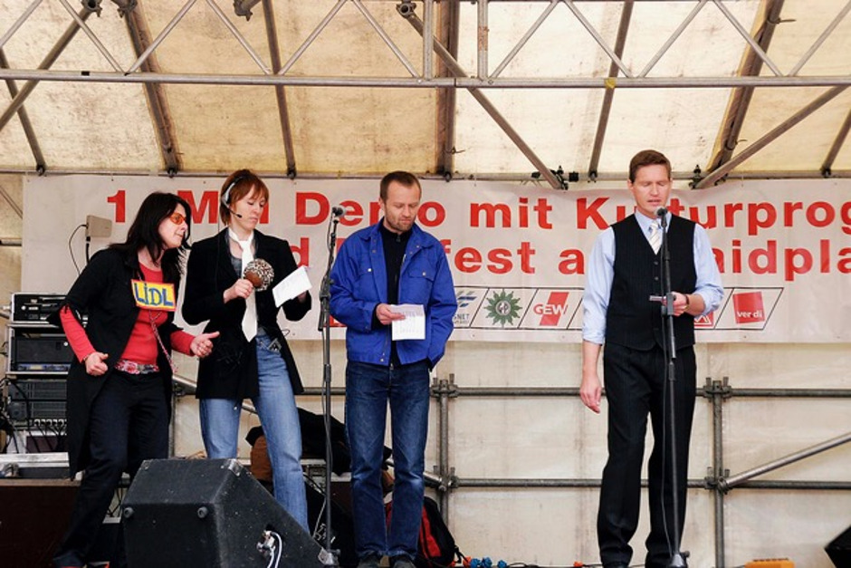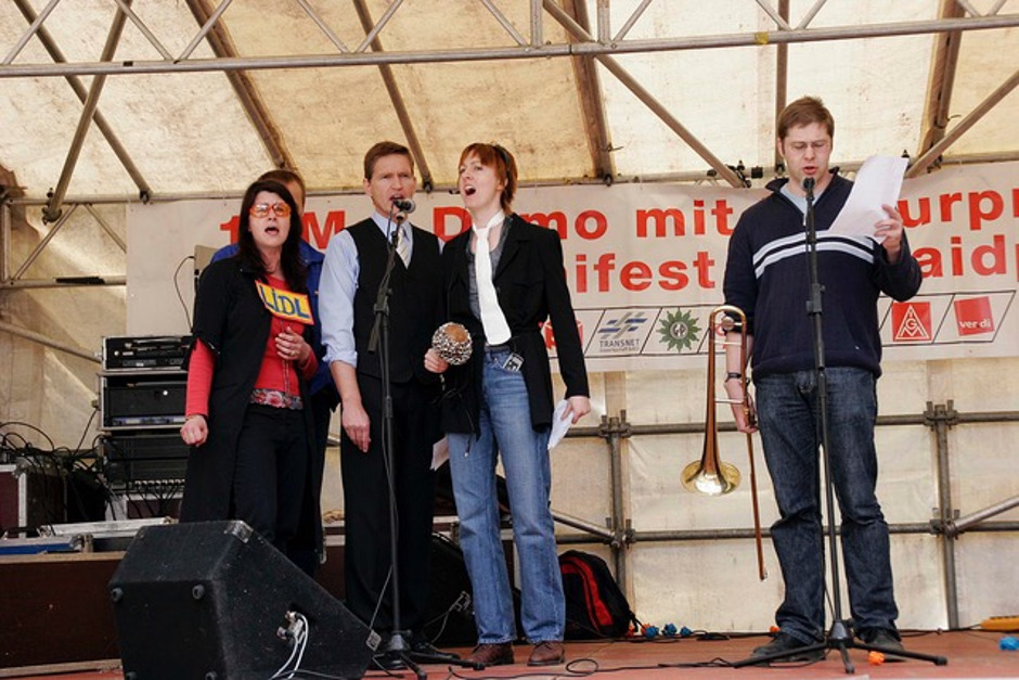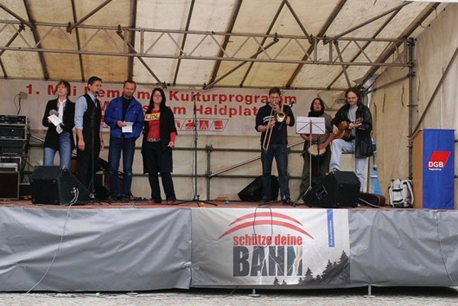 2006 probten wir im Keller des DGB Regensburg für unser Stück "großer bruder 2010 (II). Der damalige DGB-Chef Willi Dürr fragte uns, ob wir nicht etwas zum 1. Mai für die zentrale Kundgebung auf dem Haidplatz machen wollten. Gerne waren wir dazu bereit.