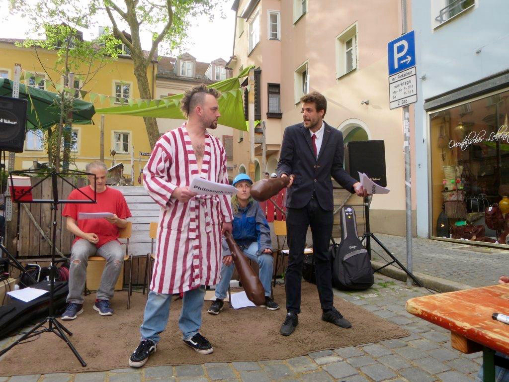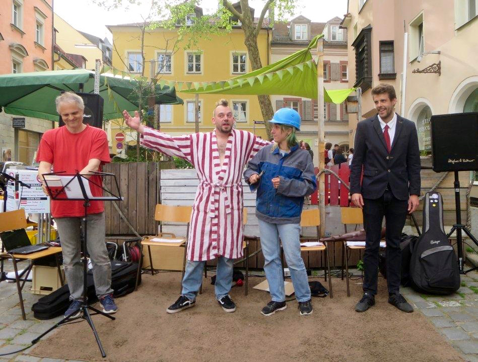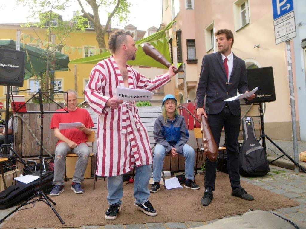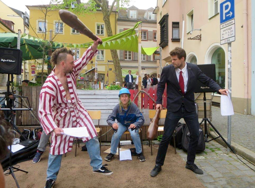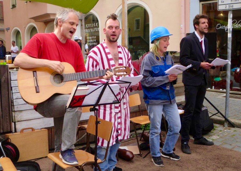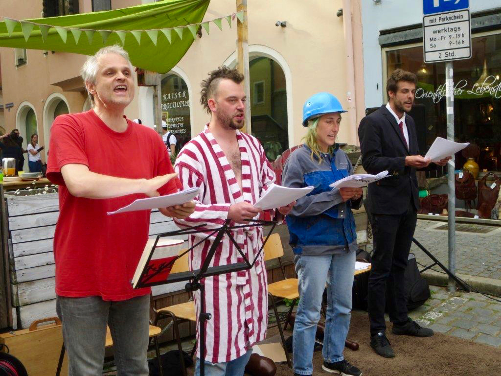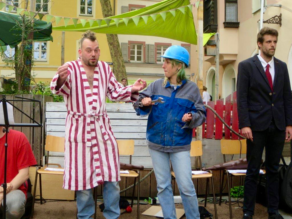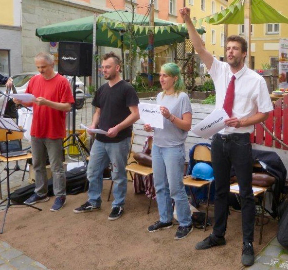 BÜRGERTUM: (singt) Es rettet uns kein höh’res Wesen / kein Gott, kein Kaiser noch Tribun / Uns aus dem Elend zu erlösen / können wir nur selber tun!