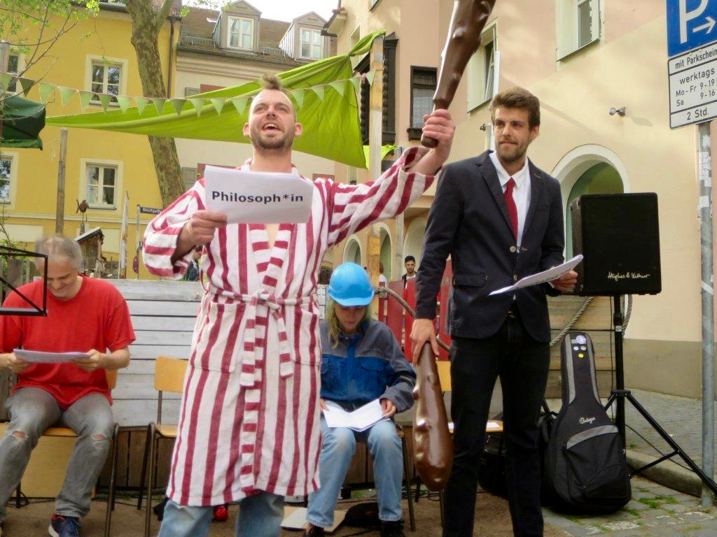 PHILOSOPHIE: (nimmt Arbeiterin in den Arm) »Genieße!« Genieße! Genieße!