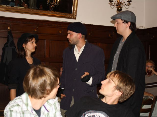Immer wieder unterbrechen die Kapitalisten und versuchen Brecht nach Kräften zu entwerten. Aus dem „Lob des Kommunismus“ wird „Lob des Kapitalismus“, aus dem „Lied vom Flicken und vom Rock“ wird das „Lob der Sozialpartnerschaft usw. Doch zum Schluß wird es den Brechtschauspielern zu bunt. Unter dem Drohgesang „Wer noch lebt, sage nicht niemals!“ werden die Kapitalisten des Saales verwiesen. Hier bezieht das ueTheater also eindeutig Stellung.