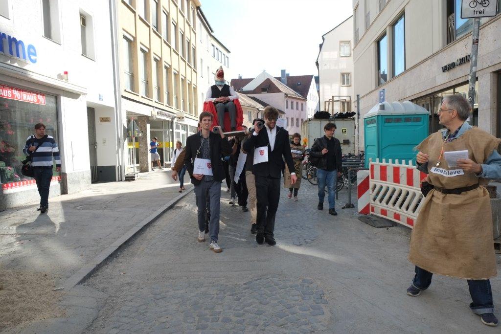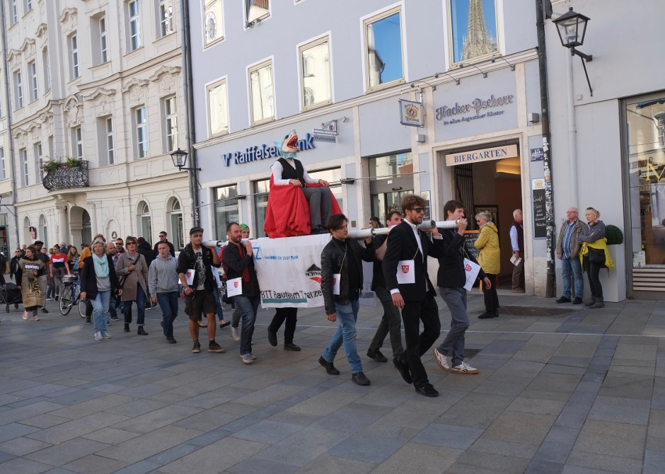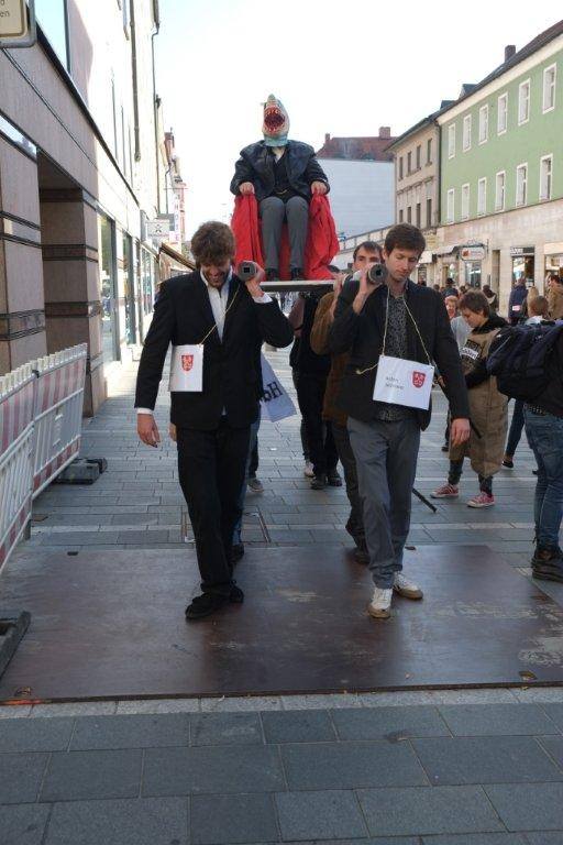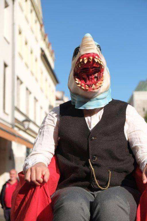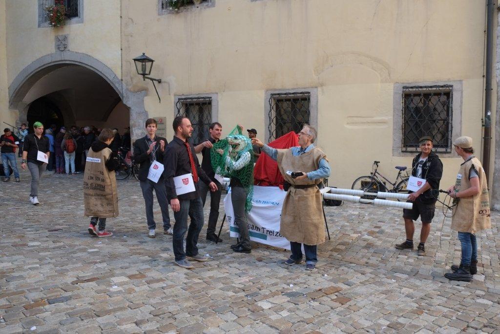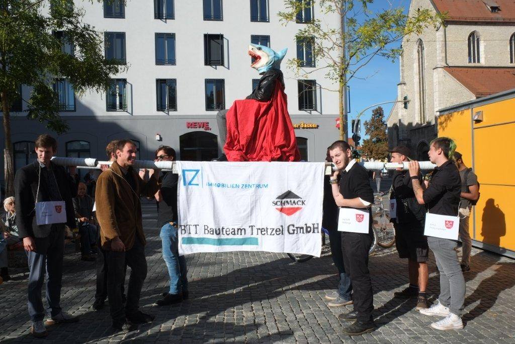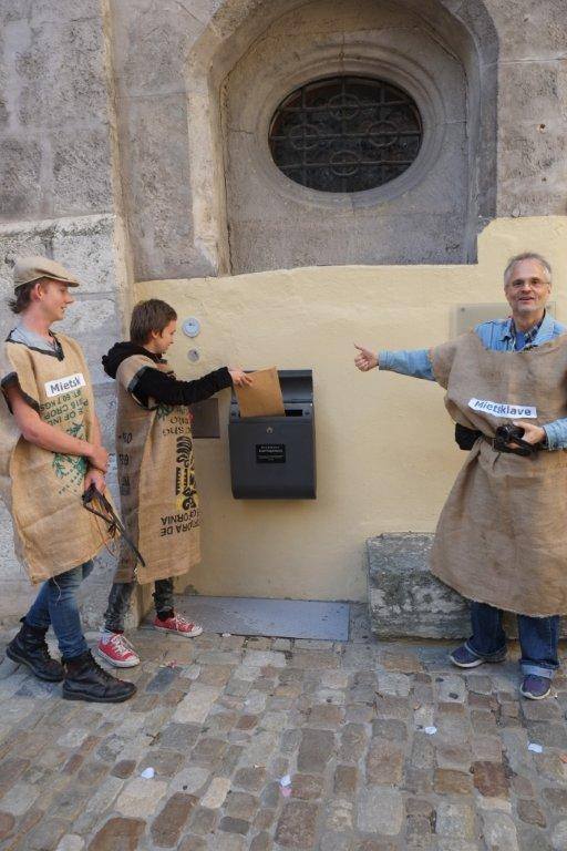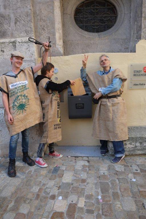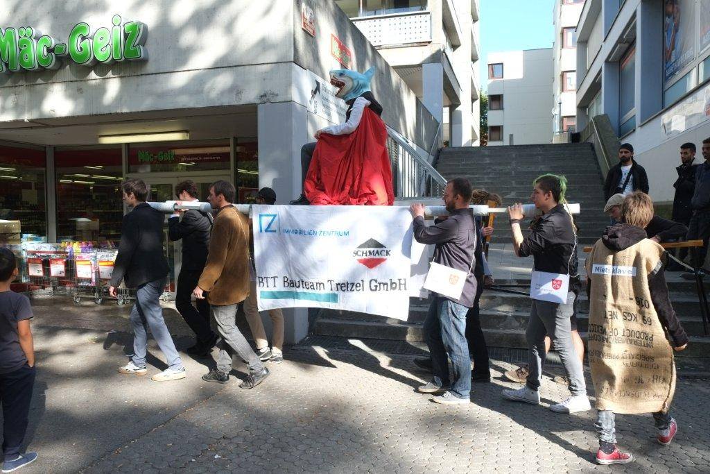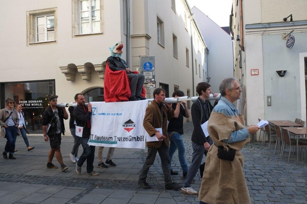 (Bepeitschte Mietsklaven zwingen Politiker*innen und Beamte, den Immohai mit einem Netz zu fangen. Danach wird die Eingabe an den Stadtrat, die Regensburger Immohaie zu enteignen, in den bürgermeisterlichen Briefkasten geworfen.)