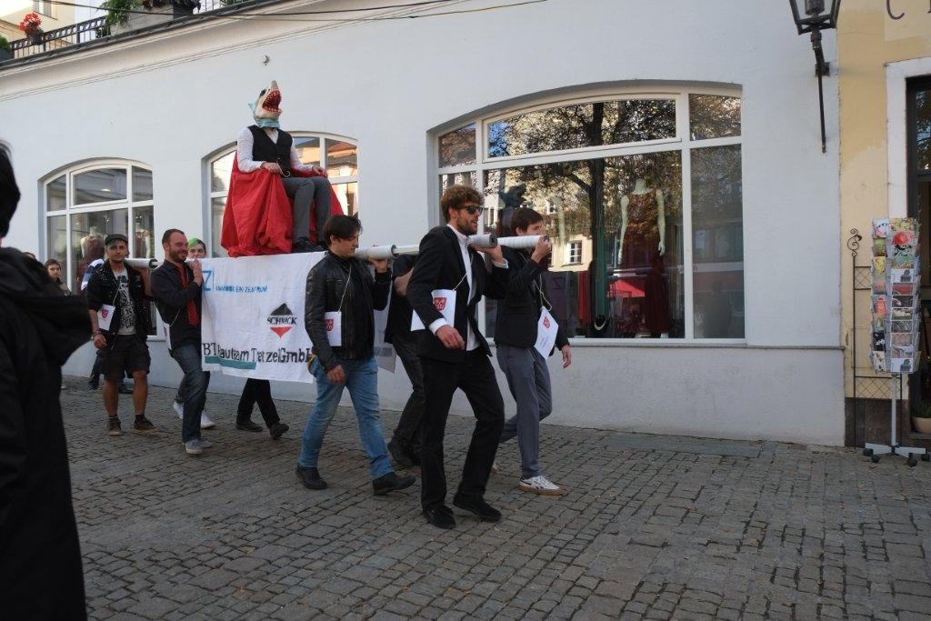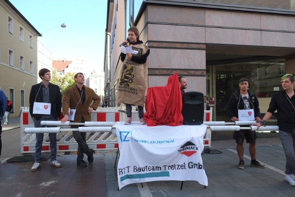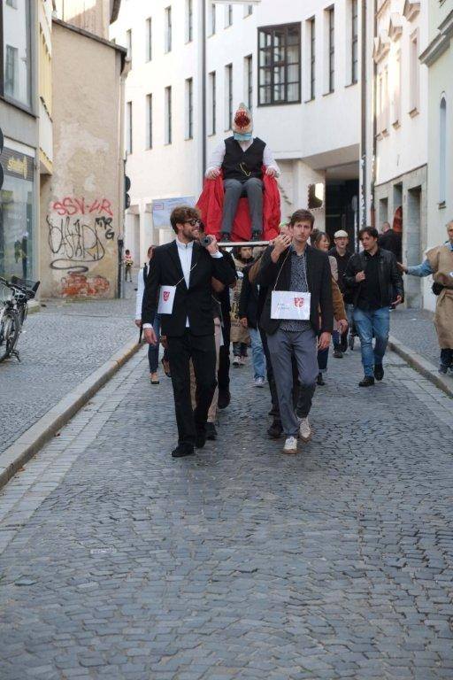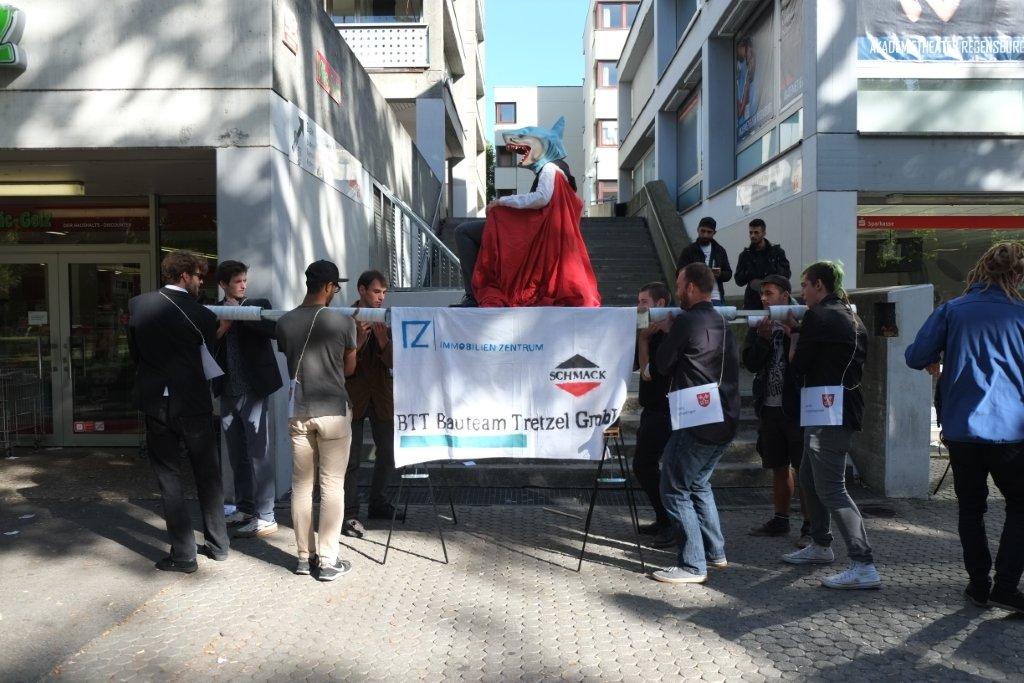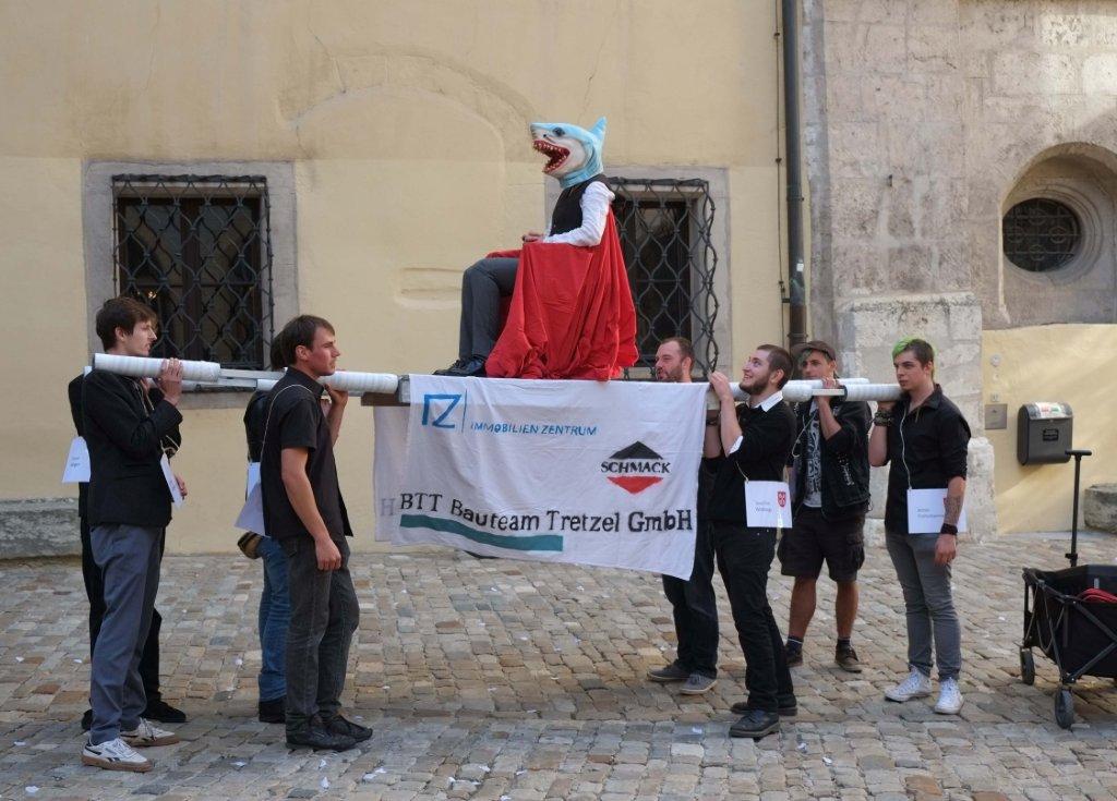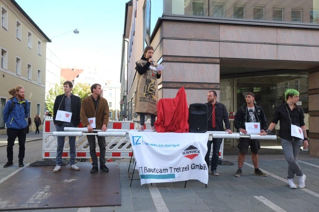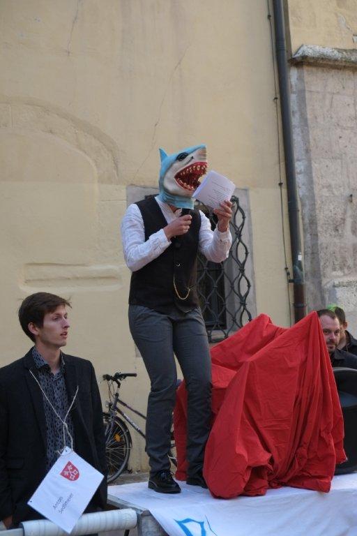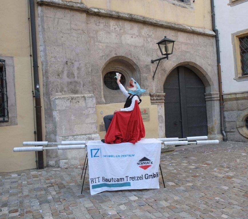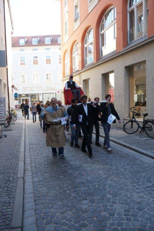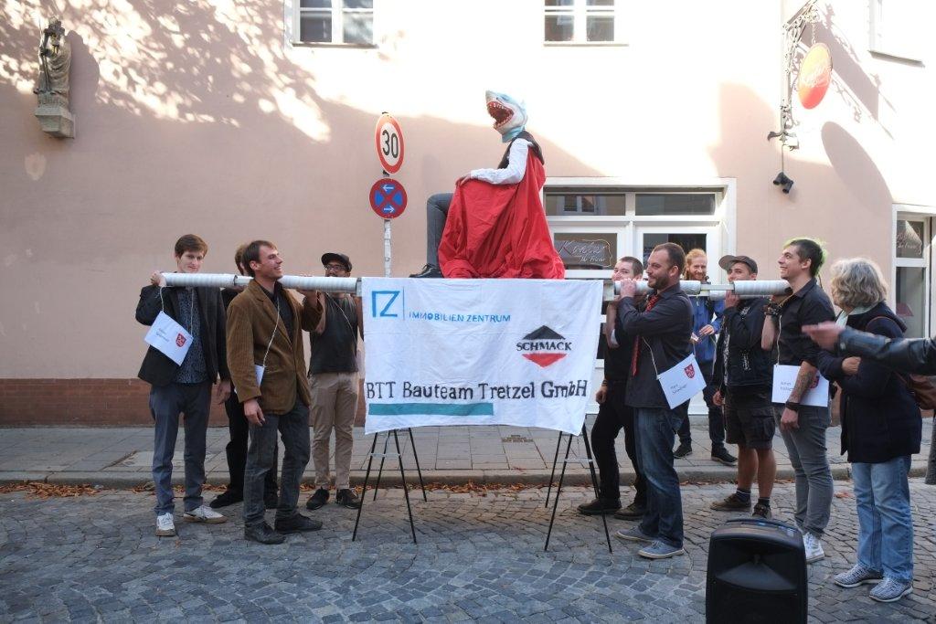 (Bepeitschte Mietsklaven zwingen Politiker*innen und Beamte, den Immohai mit einem Netz zu fangen. Danach wird die Eingabe an den Stadtrat, die Regensburger Immohaie zu enteignen, in den bürgermeisterlichen Briefkasten geworfen.)