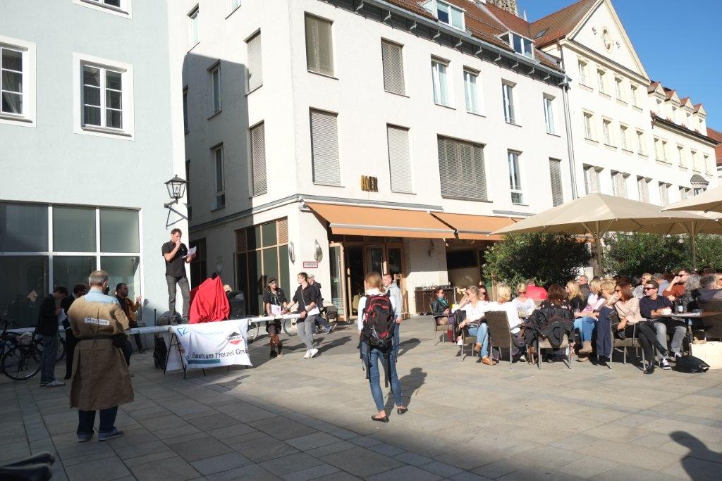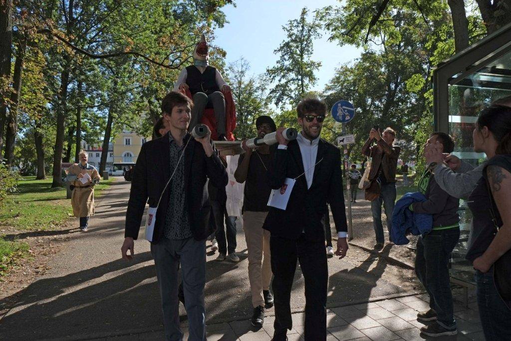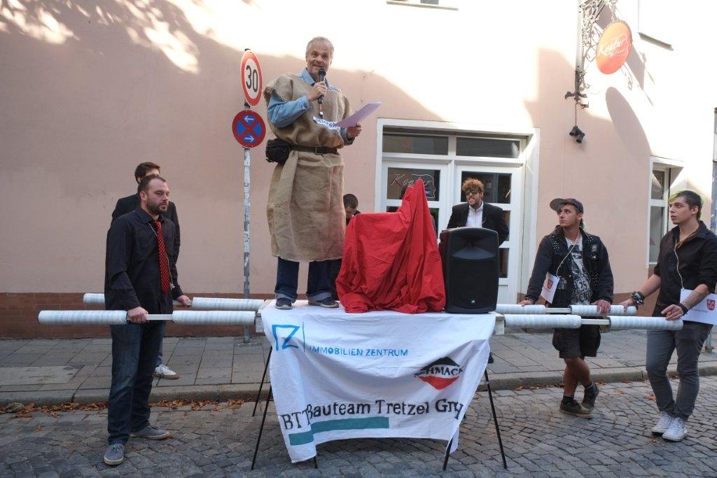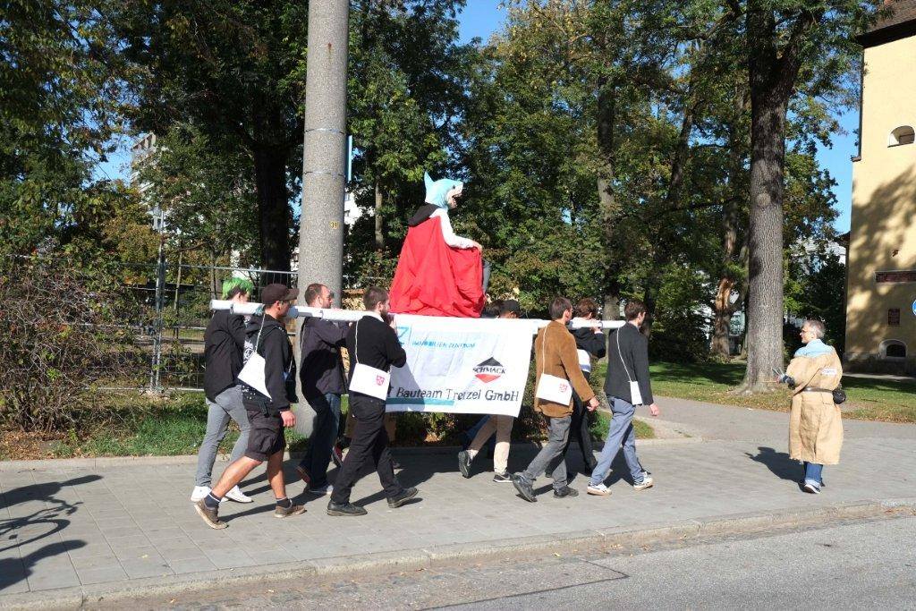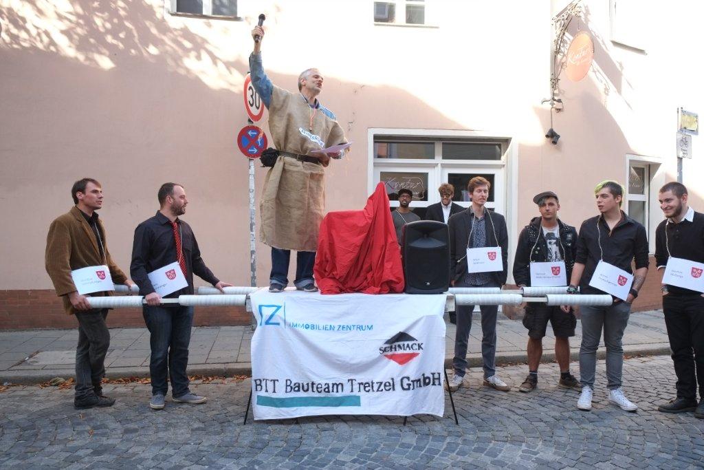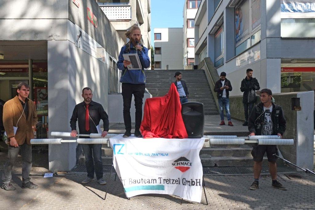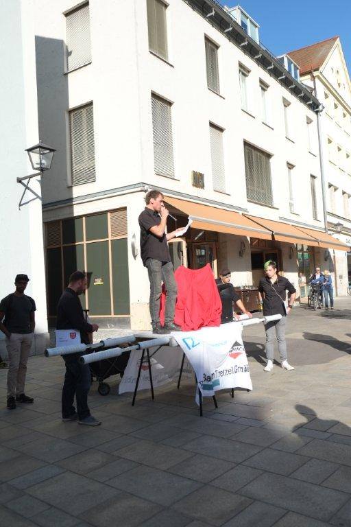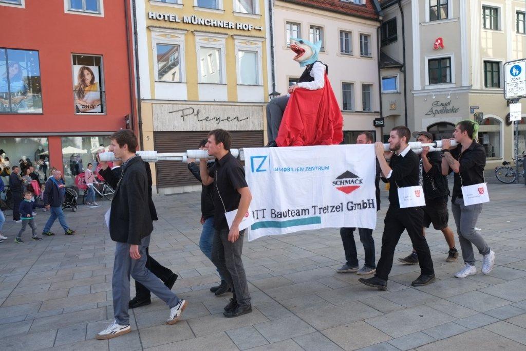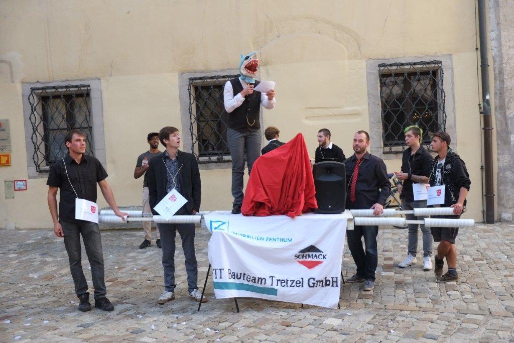 (Bepeitschte Mietsklaven zwingen Politiker*innen und Beamte, den Immohai mit einem Netz zu fangen. Danach wird die Eingabe an den Stadtrat, die Regensburger Immohaie zu enteignen, in den bürgermeisterlichen Briefkasten geworfen.)