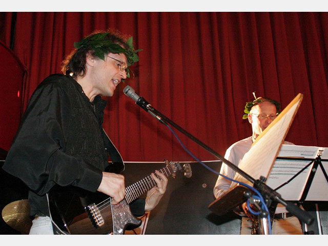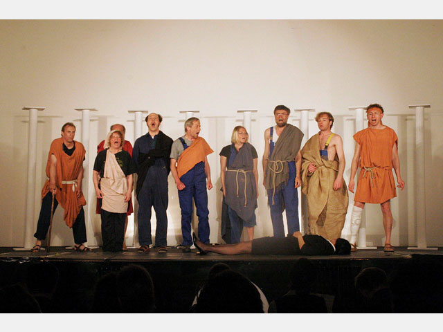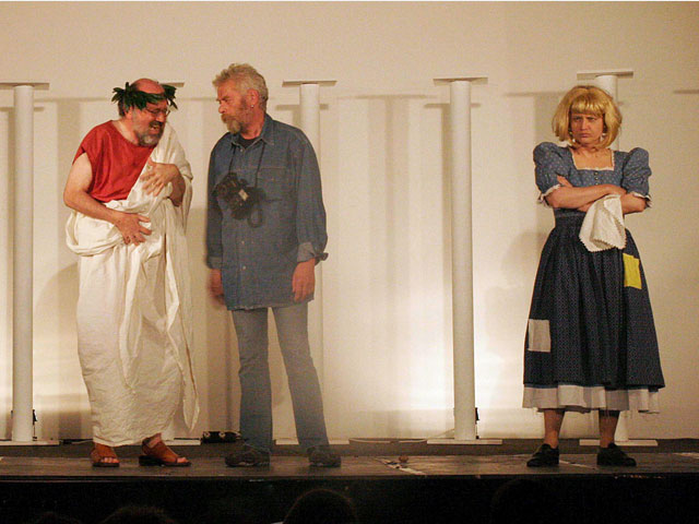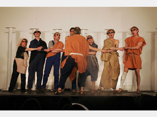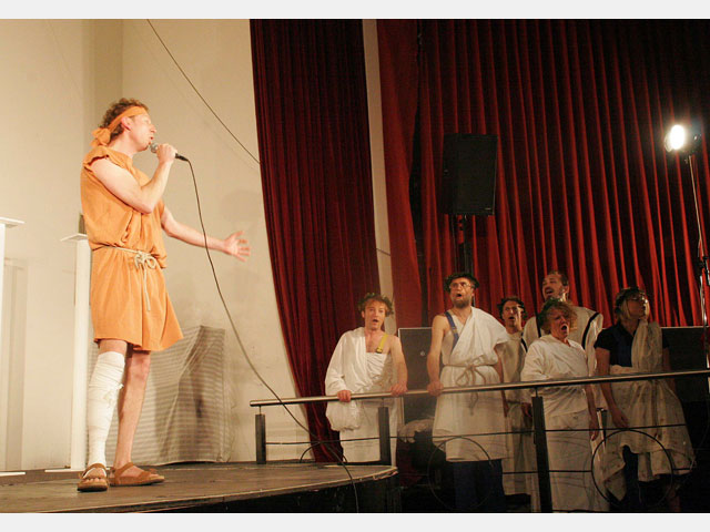 Gemeinschaftlich wird sie niedergerungen – und das ist jetzt nicht mehr Aristophanes, sondern Kurt Raster. Bei Aristophanes wird Penia allein durch die verbalen Attacken des Chremylos in die Flucht geschlagen, und natürlich intoniert der Chor hinterher auch nicht, von einer veritablen Band angeführt, „Vorwärts, und nicht vergessen“. Die von der ganzen Theaterkompanie im Gloria mit Lust und Unbefangenheit ausgelebte Agitprop-Leidenschaft (die auch die lokalen Großkopferten genüsslich miteinbezieht), wurde gottseidank immer wieder von einem charmanten Schalk in Latzhose konterkariert, der die hochfliegenden Bühnenphantasien mit Spott und Ironie auf den Teppich zurückholte. Ohne Aristophanes gelesen zu haben, meinte Hegel, lässt sich kaum wissen, wie dem Menschen sauwohl sein kann. Sauwohl fühlten sich in dieser „Plutos“-Inszenierung sichtlich alle, sowohl die 25-köpfige Schauspielertruppe als auch das Publikum. Vorwärts, und nicht vergessen: immer dem Affen schön Zucker geben!