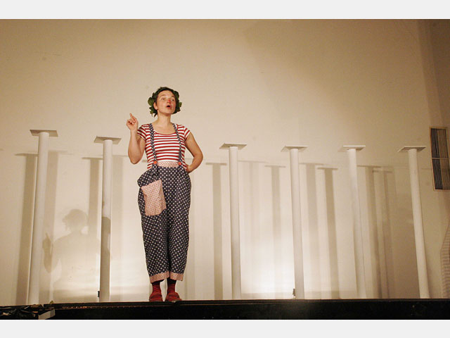 HARLEKIN: Wir haben nichts zu verlieren als unsere Ketten und eine Welt zu gewinnen. Wir können alles, wenn wir nur wollen. Wir können aber auch die nächsten 2500 Jahre im Theater zusehen, wie man eine Welt gewinnt. Wir müssen gar nichts tun, es ist ja unser Leben. Wir können auch genausogut einen Kopfstand machen. Soll ich einen Kopfstand machen. Sollen wir alle einen Kopfstand machen? Ja? Auf drei: Eins, zwei, drei!