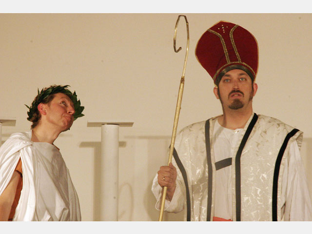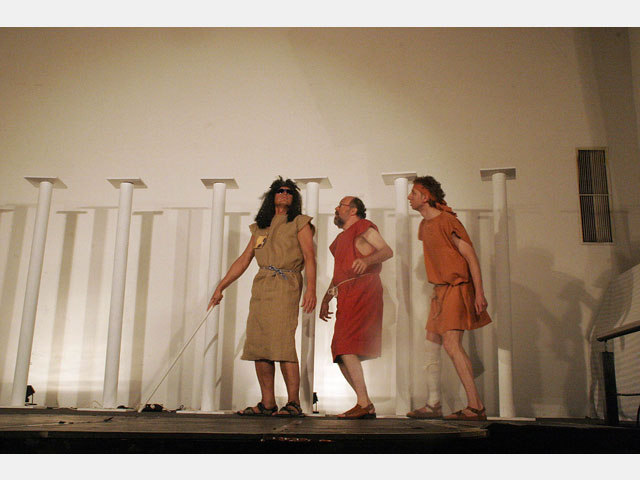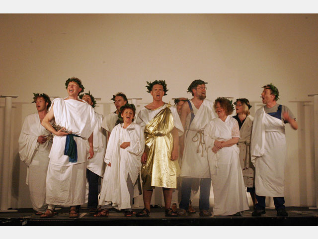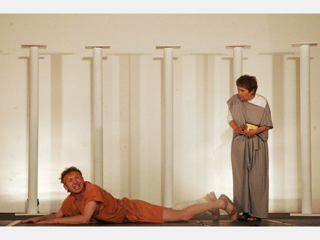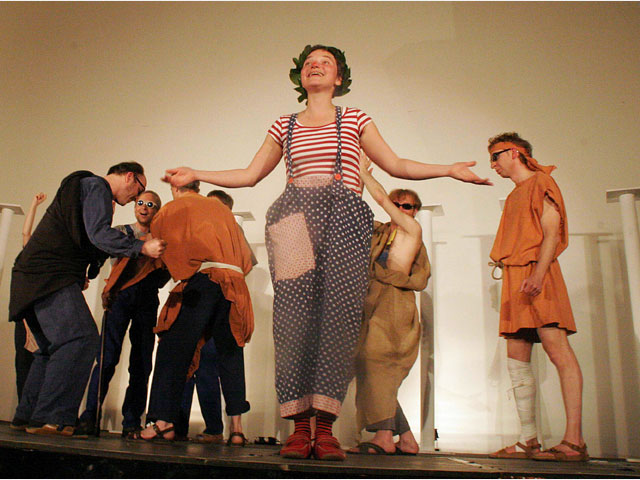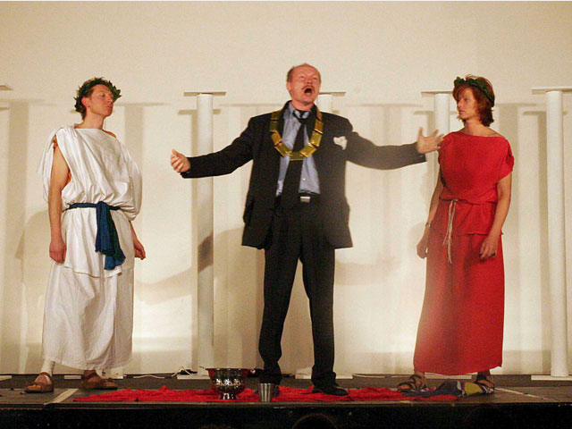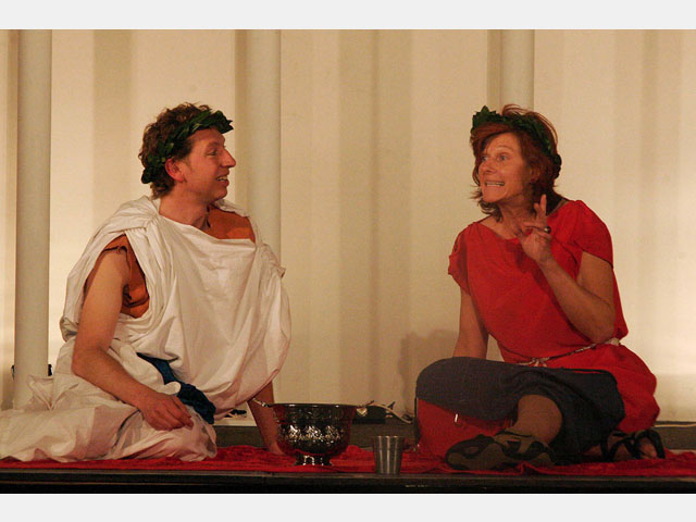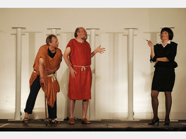 Was tun? Chremylos schleppt Plutos ins Heiligtum des Asklepios, dessen Schlangen lecken Plutos’ blinde Augen, der Gott des Reichtums kann wieder sehen, und ab sofort wird alles anders: Plutos lässt sich nicht mehr von jedem dahergelaufenen Lumpen überreden, mitzukommen, er sieht sich die Leute zuerst an, bevor er ihr Haus betritt. Die ungerechte Verteilung der Güter hat ein Ende, eine neue Zeit bricht an. – Wer gemeint hätte, die aktuelle Diskussion um soziale Gerechtigkeit, Mindestlohn und bedingungsloses Grundeinkommen sei eine Erfindung der Linken des 21. oder zumindest des 20. Jahrhunderts, wurde in Kurt Rasters amüsant-gekonnter Inszenierung von Aristophanes’ „Plutos“ um 2400 Jahre zurückkatapultiert: Nichts Neues unter der Sonne.