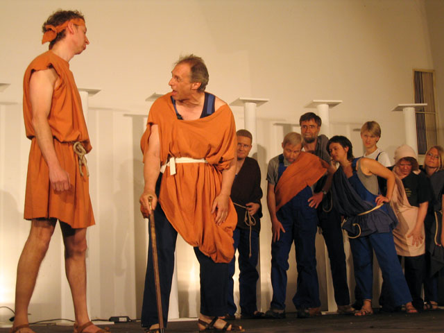 Die Griechen hatten die Angewohnheit, zwischen ihre Szenen direkte Ansprachen ans Publikum zu setzen, sogenannte Parabasen. Da diese für den Plutos leider nicht überliefert sind, haben wir uns erlaubt, selbige nachzudichten, allerdings so, wie sie Aristophanes heute geschrieben hätte :-).