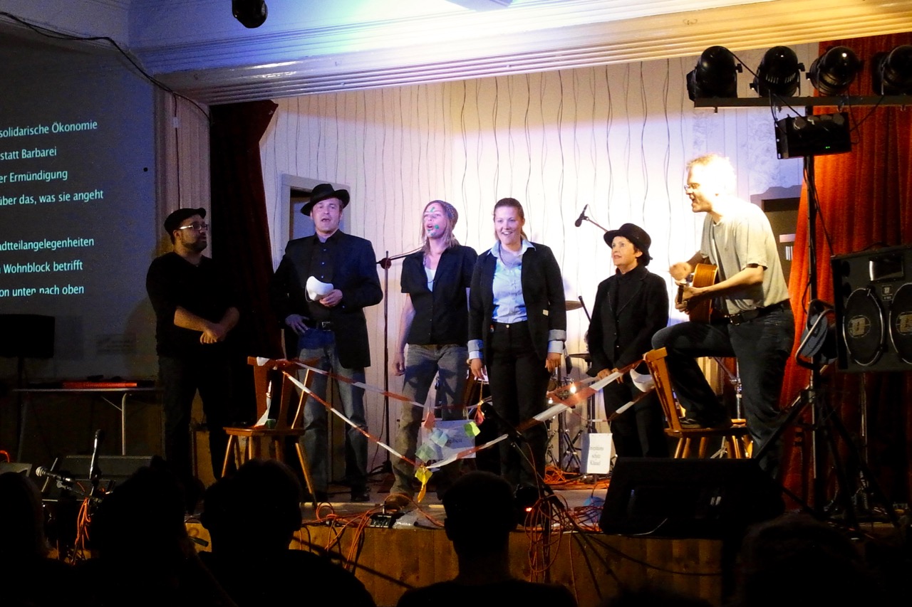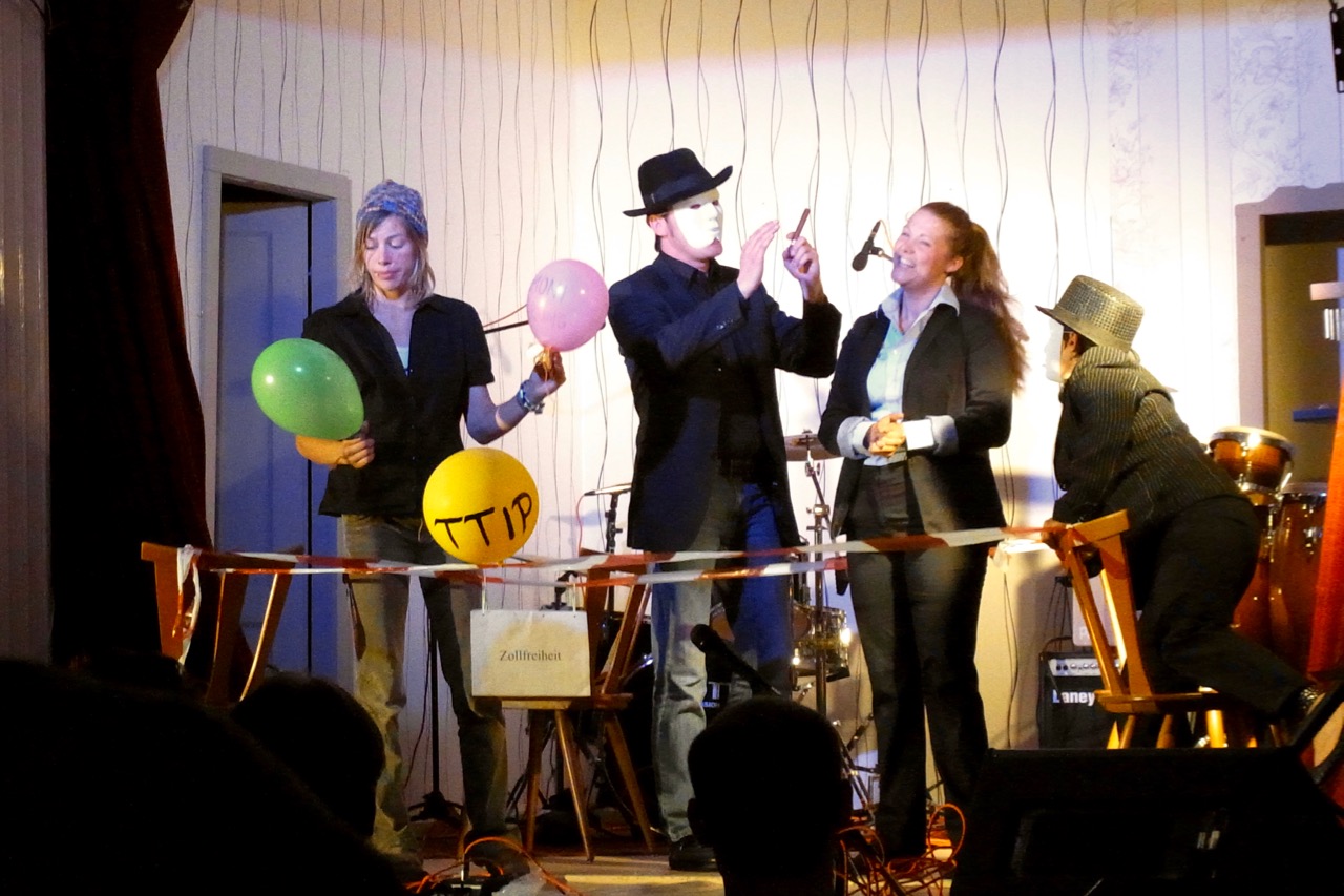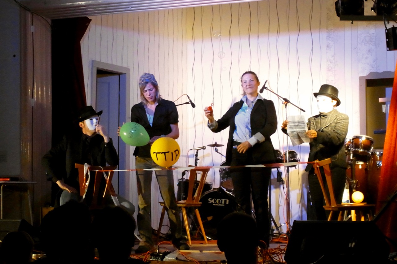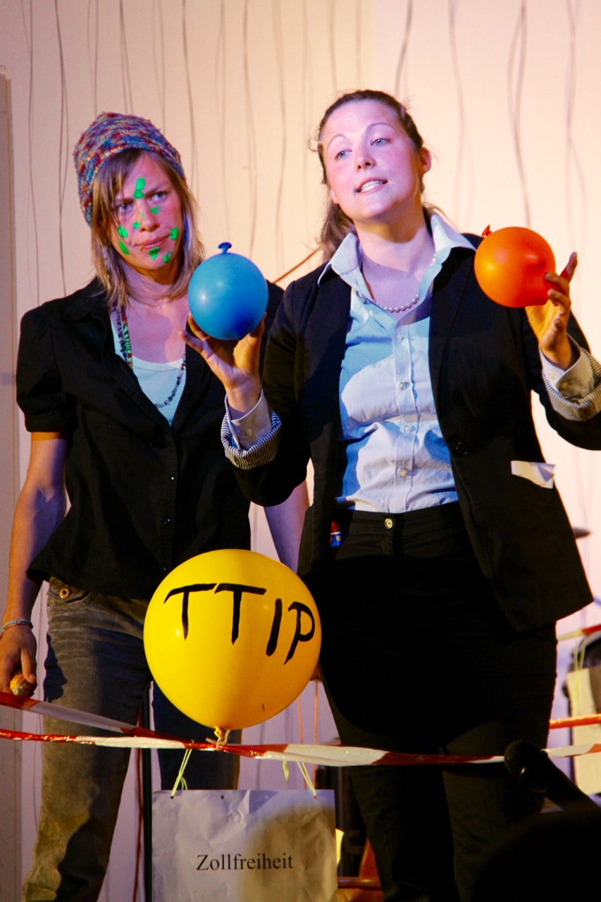 "Politischer Höhepunkt war eindeutig das ueTheater mit seinen extra für die Kul.tour konzipierten Stück „TTIP-Theater in vier Akten“. Diese Stück möchten wir unbedingt auch für andere Anlässe und für andere attac-Gruppen aus der Region weiterempfehlen. Es ist wirklich ein Aufrüttler und Hingucker – dass auch unsere Kids in Europa auch endlich zum 6. Geburtstag ihr „My first Rifle“-Präsent in Rosa und Geschenkkarton kriegen!"