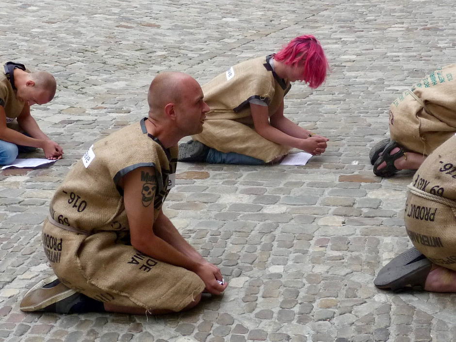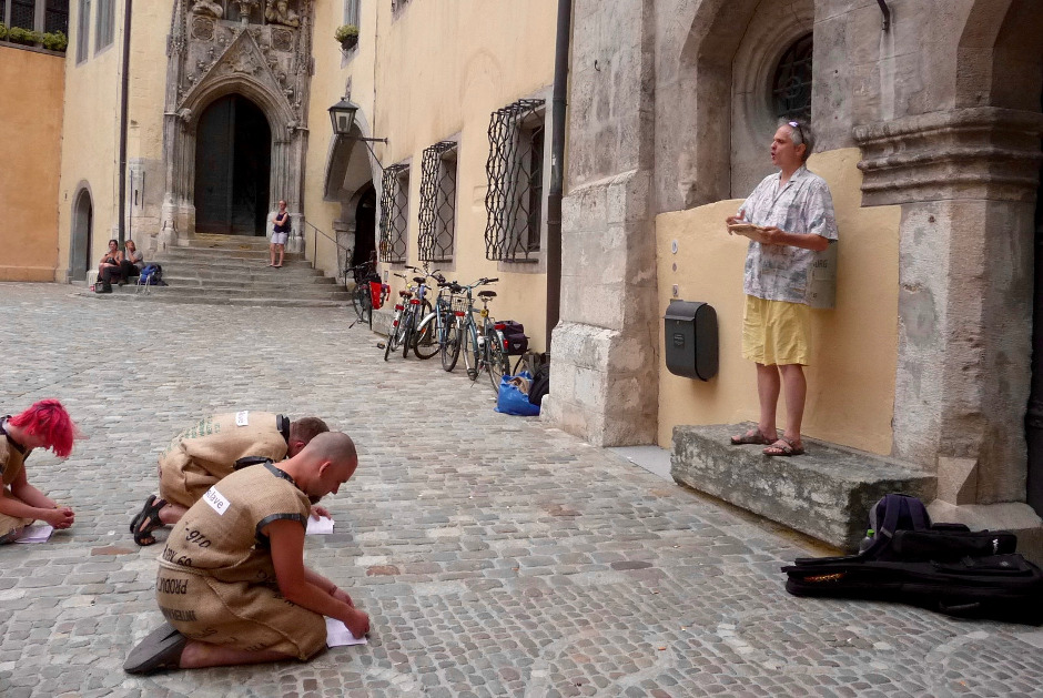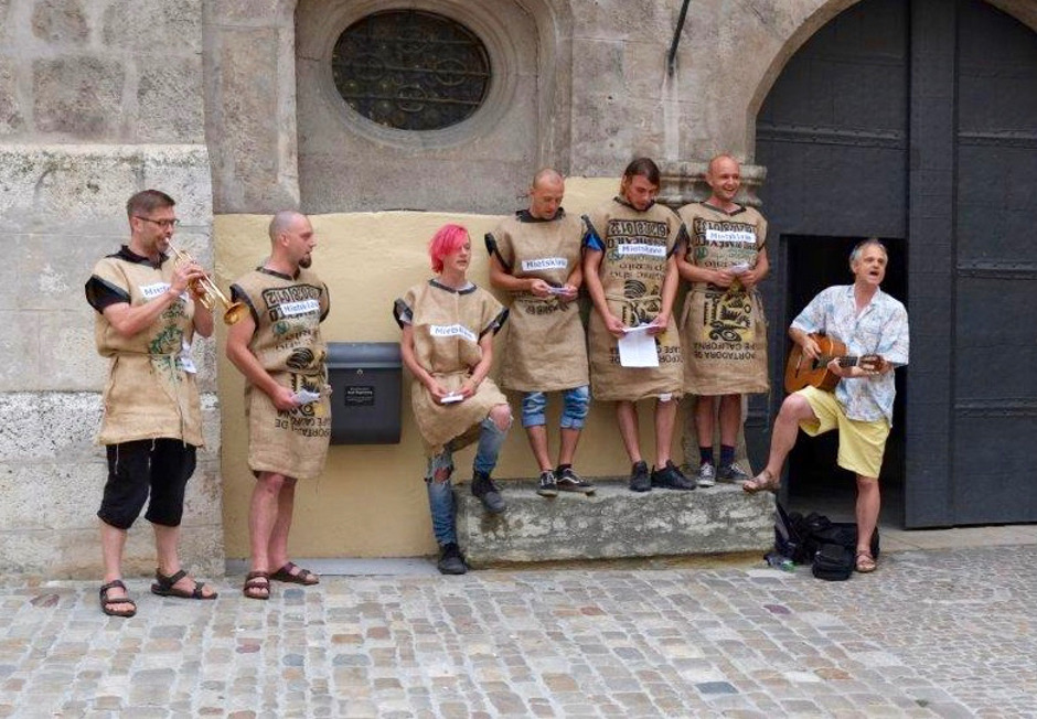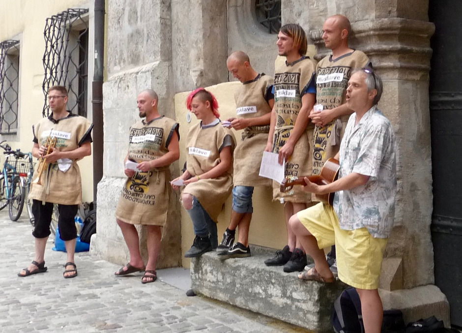 (Sklaven übergeben Petition der Stadtregierung und singen anschließend folgendes Lied)