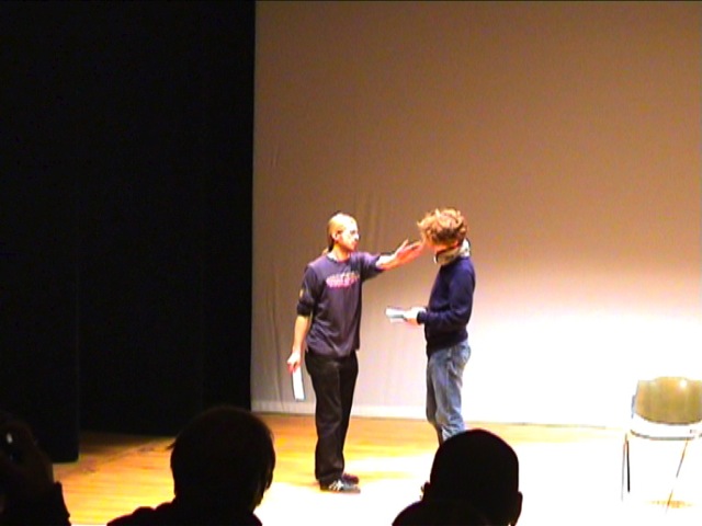 Also los. Nach einer kurzen Einführung der Moderatorin in das Konzept zum Forumtheater: Spot an. Ein junger Mann sitzt auf einem Stuhl in der Mitte der Bühne. Die Ellbogen auf die Knie gestützt, ab und an die Haare raufend. Bis es klopft: Die Post ist da. Bevor der angehende Student den Brief in den Händen halten kann, kassiert er allerdings erstmal ein lautes Nein und eine gesalzene Ohrfeige. Nicht nur einmal. Warum? In jedem Brief die Absage einer anderen Hochschule. Frankfurt, Heidelberg, München. NC nicht erreicht. Das war's. Aus der Traum vom Biologie-Studium. Der Student entscheidet sich für Jura. Kein NC gefordert. „Dann werd ich halt so 'n Paragraphenfuzzi!“.
