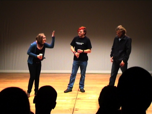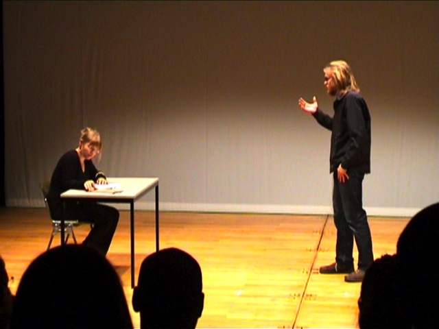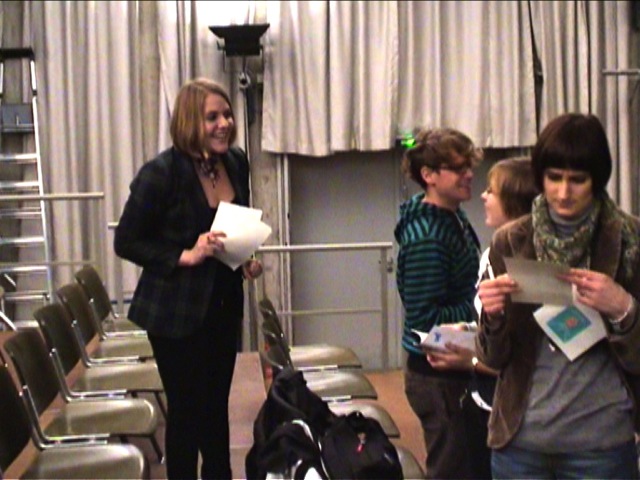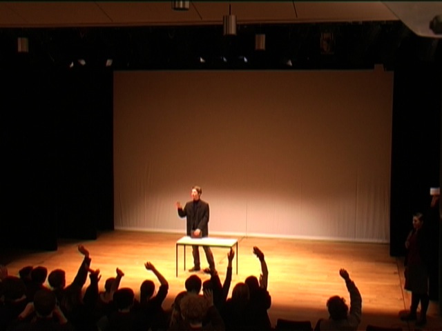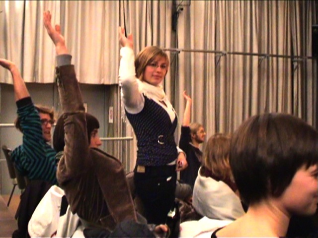 Auch die Prüfungssituation wurde erneut angespielt. Mehr Verständnis vom Prüfer und ein solidarischeres Miteinander unter den Prüflingen wurde hier gefordert. Letzte nochmals angespielte Szene war die Situation in der Vorlesung, in welcher die Studierenden den Professor gebeten hatte, die Veranstaltung zugunsten der Demonstration ausfallen zu lassen. Hier war das Publikum besonders gefordert, denn nun war mit einem Male jede und jeder TeilnehmerIn der Vorlesung. Es wurde auf den Stühlen herumgeklopft, der Professor kam vor lauter Zwischenrufen nicht zum Reden. Die Bandbreite reichte von „Sie werden doch auch aus Studiengebühren finanziert!“ über „Gehen Sie doch selber auch mit!“ bis hin zu „Also MEINE Eltern zahlen meine Gebühren. Warum sollte ich auf eine Demo gehen?“. Bevor die Szene in ein lautes Spektakel ausarten konnte, beendete die Moderation das Schauspiel gekonnt: „Ich denke, wir haben nun alles gehört und können zur Abschlussdiskussion übergehen.“ Nun wurde rekapituliert. Was hätte man anders machen könne, welche Vorschläge haben vielleicht gefehlt? Auf welche Themen wurde zuwenig eingegangen?