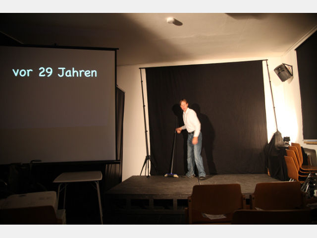 STRASSENREINIGER/IN: (putzt Schild „Stadtbau“) Ach, ich putz nur die Stadtbau, die ist nicht ganz sauber.