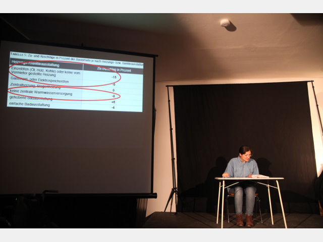 BAUER: (tippt etwas in Taschenrechner) Hm, wenn man den Zuschlag für die gute Wohnlage weglässt, sind wir mit der Mieterhöhung immer noch unter der Vergleichsmiete, war ja mal eine Sozialwohnung und ist entsprechend günstig, solange nicht modernisiert wird. Da kann man jetzt eigentlich gar nichts machen.