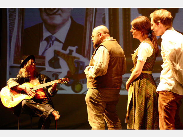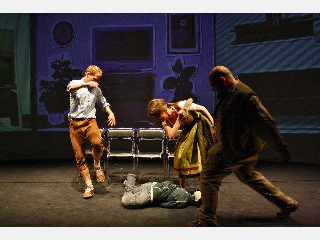 Dennoch, Fassbinders Stück, ebenso wie seine Umsetzung durch das ueTheater, ist keine Gutmenschen-Lehrstunde, die uns mit erhobenem Zeigefinger eintrichtert, wie schön es denn sein könnte, wenn nur alle vernünftig wären. Es entlarvt den Mythos der „Anarchie von oben“ als Widerspruch in sich und konfrontiert das Publikum mit einer unbequemen Wahrheit, nämlich dass Freiheit etwas ist, womit man erst einmal umgehen können muss. Eine in Reih und Glied angetretene Familie Normalzeit, auf der verzweifelten Suche nach jemandem, der ihr die Angst vor der Freiheit nehmen kann, ist Parabel hierfür; Vater Normalzeit, kongenial dargestellt von Thomas Jahnke, in steter Sorge um Auto, Fernseher und Familie – in etwa dieser Reihenfolge – weiß dann auch mit der neuen Freiheit nichts besseres anzufangen, als sie als Rechtfertigung für einen Mord heranzuziehen. Der Lacher, den er mit seinem verzweifelten Ausruf „Warum ag'rat mei Auto?“ noch hervorruft, bleibt einem im Halse stecken, wenn man später im Schattenriss mitansieht, wie er einen ihm völlig Unbekannten zu Tode prügelt. Daran krankt in Fassbinders Stück die Anarchie, und daran scheitert sie, denn wie es in dem Lied von der Freiheit heißt, „der Mensch ist leider nicht naiv, der Mensch ist leider primitiv…“