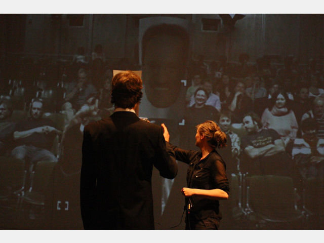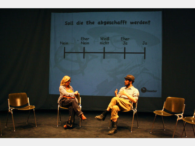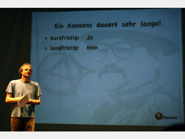 Aber das ueTheater lässt sein Publikum mit diesen verstörenden Szenen nicht allein. Nach einer kurzen Pause, und eingebettet in die sympathische Moderation von Regisseur und Theatergründer Kurt Raster, folgt auf Fassbinders Dystopie ein Film über ein gelungenes Projekt einer basisdemokratisch selbstverwalteten Initiative, nämlich der landwirtschaftlichen Kooperative „Cecosesola“ in Venezuela. Dort arbeitet man von der Basis her, und auch wenn das dennoch nicht zur Entstehung eines anarchistischen Wunderlandes geführt hat, der Erfolg gibt den Lateinamerikanern recht. Immer wieder fällt in den Diskussionen ein Kernbegriff libertärer Organisationsstruktur – der Konsens. Und das leitete dann auch zum dritten Teil des Abends über, zu den Konsensübungen. Das Stimmungsbarometer als Meinungsbild(ung) zum Mitmachen, das Fischbecken als Variante der klassischen Diskussion, vorgestellt an der im Stück aufgeworfenen Frage, ob die Ehe abgeschafft werden soll oder nicht, irgendwo zwischen Werkzeug und Spielzeug.