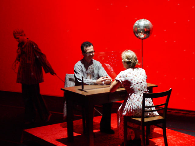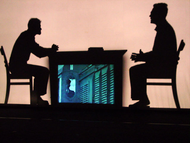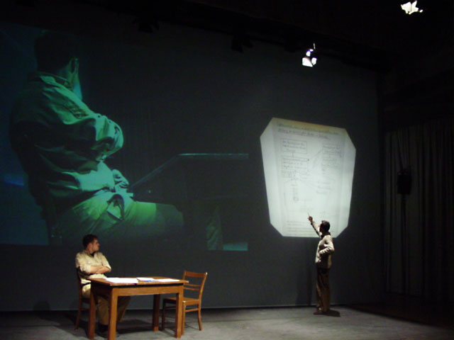Der Autor bleibt an dieser Stelle nicht stehen, sondern zieht Analogien in die heutige Zeit. Raster wirft erschreckende Bilder auf die Leinwand hinter Eichmanns Zelle und fügt Texte hinzu, die unter dem Eindruck der Bilder in einem anderen Licht stehen.