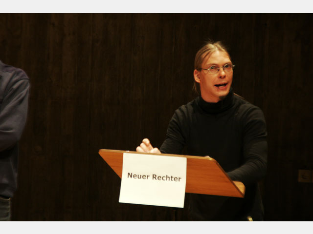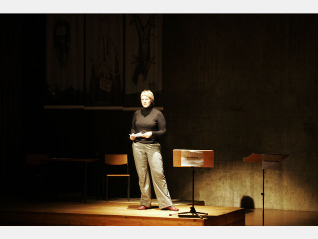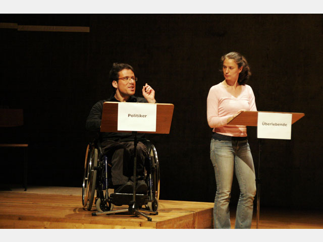 Zwischen diesen poetisch-pathetischen O-Ton-Monologen gibt es in fünf Runden eine illustre typisierte Talkshow, moderiert von einer wiefen Soziologin, in der ein Durchschnittspolitiker und eine Auschwitzüberlebende aufeinandertreffen, ein kommunistischer Intellektueller und ein kritischer Kirchenmann von einem Rechtsradikalen mit Pferdeschwanz gegeneinander ausgespielt werden und eine Kapitalistin, die mit allen Wassern gewaschen ist, alle Attacken geschickt pariert. Da gerät so manches Klischee durcheinander, und damit die Abwechslung perfekt ist, werden kurze Spielszenen dazwischengeschaltet, in denen drei Jungnazis ihrer Profession nachgehen (exzellent: Stefan Aigner als Ingo). Nur die beiden Szenen aus dem Buch „Unter Glatzen“ von Christiane Tramitz hätte man sich sparen können.