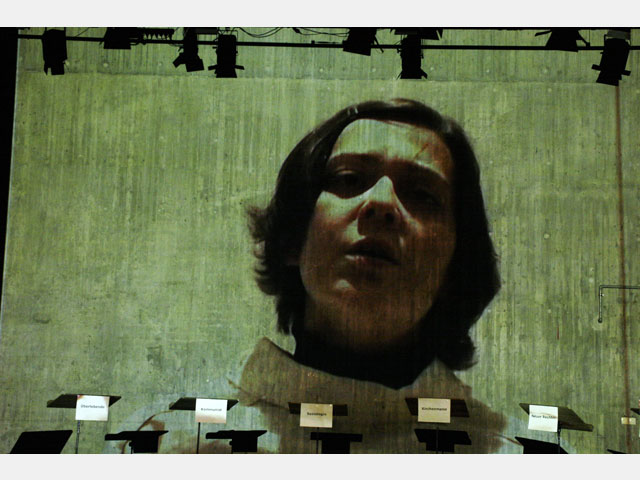 Elly Maldaque bringt Raster mit einem geschickten Verfremdungseffekt auf die Bühne: sie wird per Videobeamer an die Betonwand projiziert. Dort predigt das Fräulein Lehrerin (ausgezeichnet: Daniela Völkl) auf dem Bett der Irrenanstalt, von Pflegern überwältigt, in die Zwangsjacke gesteckt, von der Freiheit des Menschengeschlechts, bis sie auf der berüchtigten Scheibe festgeschnallt ist. Man will die bösen Geister per Zentrifugalkraft aus ihr austreiben. Operation gelungen, Patient tot.