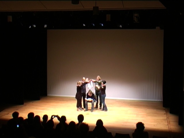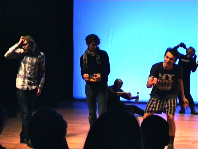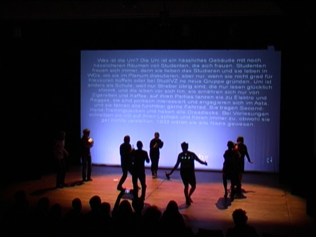 Knapp 500 Euro kalt für ein Zimmer so groß wie eine Schuhschachtel. Das Publikum murmelt. So einige werden wohl an ihre eigenen Erfahrungen erinnert. Man plaudert etwas aus dem Nähkästchen. Doch da wartet auf der Bühne schon die nächste Szene und Hürde für die Studierenden: Überfüllte Kurse, zu viele Anmeldungen für Seminare und die von der Universität vorgeschlagene Lösung: um den Platz streiten, wer zu erst kommt mahlt zuerst und nicht zu vergessen: manche Kurse gibt’s überraschenderweise nur für bestimmte Semester. Exemplarisch dargestellt am Beispiel der Vergabe der Seminarplätze für Studierende der Germanistik. Ein Haufen junger Menschen schmeißt sich übereinander und versucht, den letzten Seminarplatz zu ergattern, den sich dann doch ein Student gemütlich pfeifend abholt: schließlich erfüllt er ja das Kriterium, schon im fünften Semester zu sein.