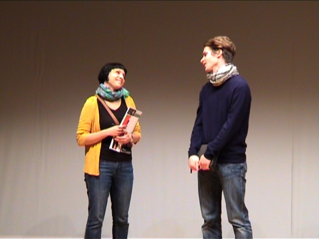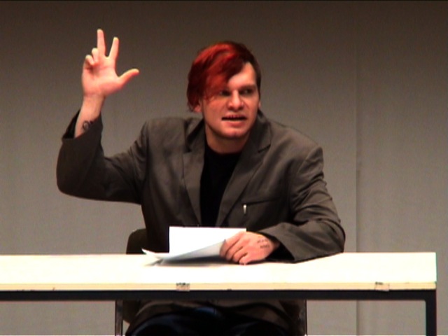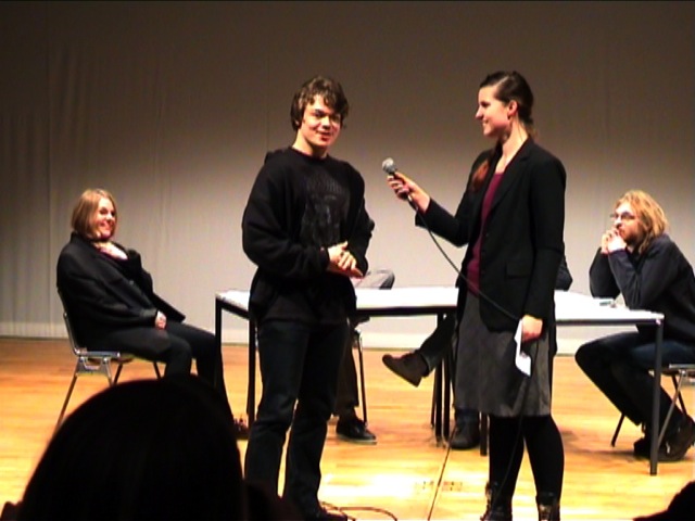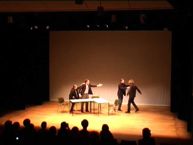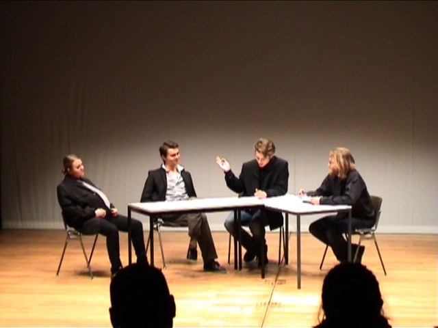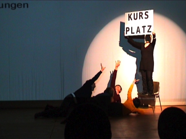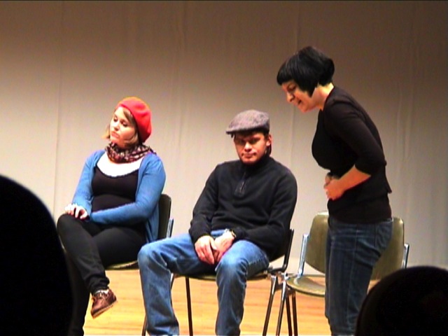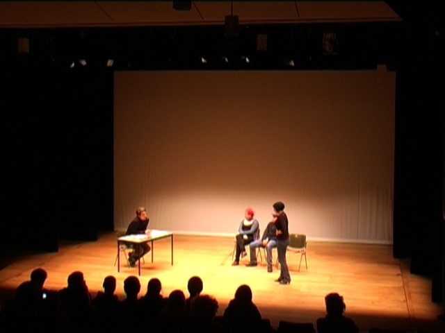 Auch die Prüfungssituation wurde erneut angespielt. Mehr Verständnis vom Prüfer und ein solidarischeres Miteinander unter den Prüflingen wurde hier gefordert. Letzte nochmals angespielte Szene war die Situation in der Vorlesung, in welcher die Studierenden den Professor gebeten hatte, die Veranstaltung zugunsten der Demonstration ausfallen zu lassen. Hier war das Publikum besonders gefordert, denn nun war mit einem Male jede und jeder TeilnehmerIn der Vorlesung. Es wurde auf den Stühlen herumgeklopft, der Professor kam vor lauter Zwischenrufen nicht zum Reden. Die Bandbreite reichte von „Sie werden doch auch aus Studiengebühren finanziert!“ über „Gehen Sie doch selber auch mit!“ bis hin zu „Also MEINE Eltern zahlen meine Gebühren. Warum sollte ich auf eine Demo gehen?“. Bevor die Szene in ein lautes Spektakel ausarten konnte, beendete die Moderation das Schauspiel gekonnt: „Ich denke, wir haben nun alles gehört und können zur Abschlussdiskussion übergehen.“ Nun wurde rekapituliert. Was hätte man anders machen könne, welche Vorschläge haben vielleicht gefehlt? Auf welche Themen wurde zuwenig eingegangen?