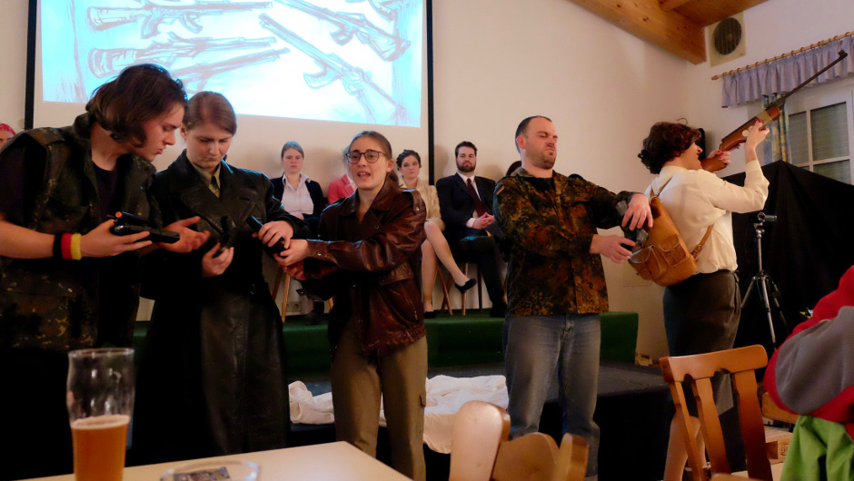 Die studentische Theatergruppe „ueTheater in Verbannung“ (*) bringt den Nürnberger Klimaverbrecherprozess auf die Bühne nebst Nazi-Terror-Gruppe.