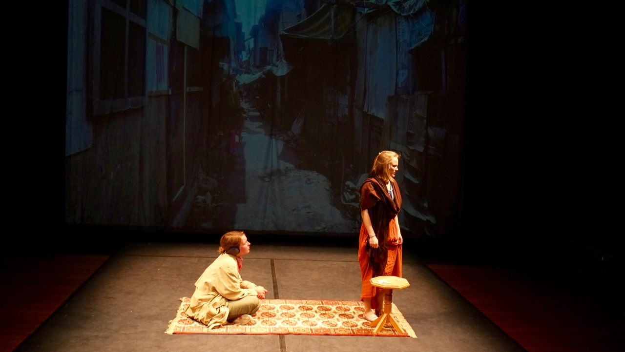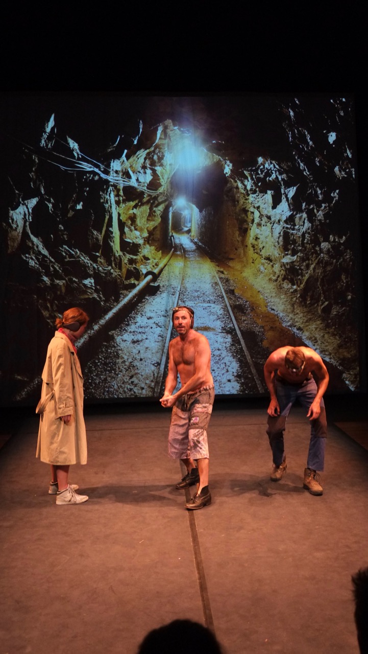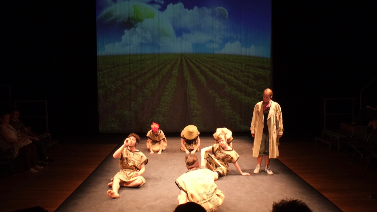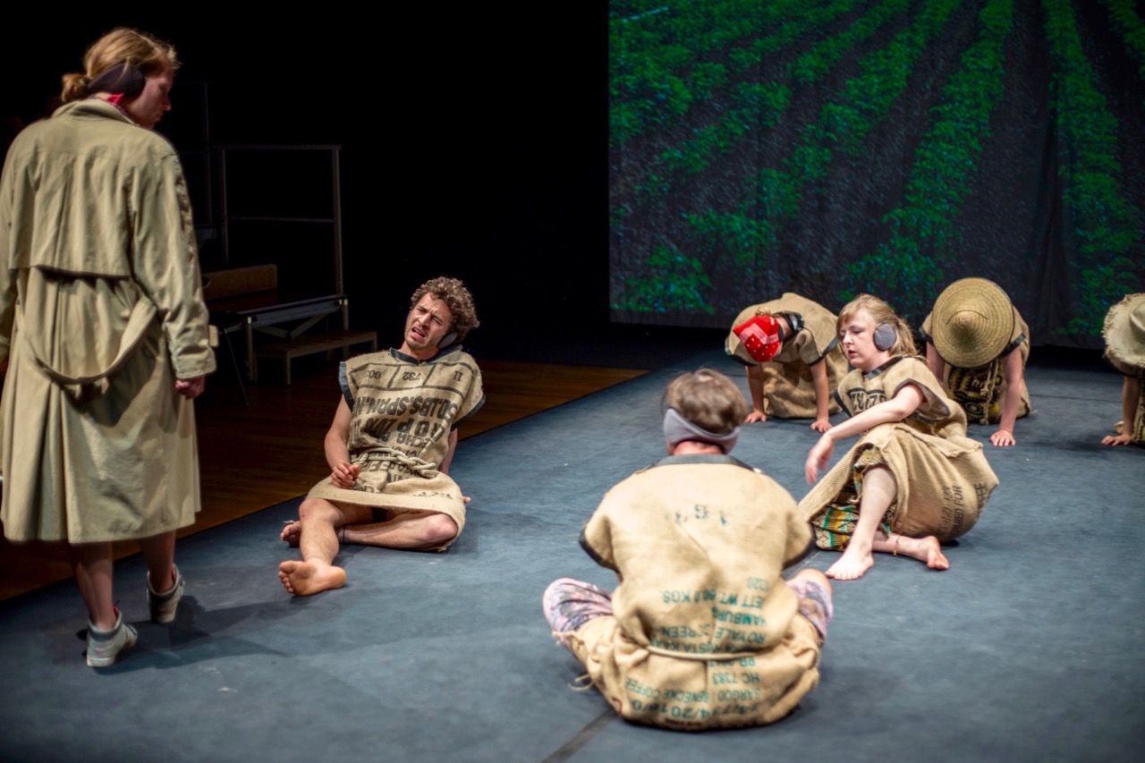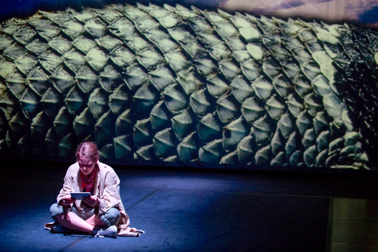 Die Bühnenadaption gibt sich schlicht. Drei Zuschauertribünen und eine Großleinwand umranden die Spielfläche. Tichy meldet sich auf der Leinwand zu Wort. Der Abenteurer erzählt in seinem Videotagebuch von überaus verstörenden Beobachtungen auf dem Planeten. Dort begegnet er hungernden Feldarbeitern, die in braune Säcke gekleidet sind. „Ehre sei dem Drachen“, predigen sie. Er trifft auf Näherinnen, die den „Drachenversorgern“ für einen Hungerlohn Hosen schneidern.