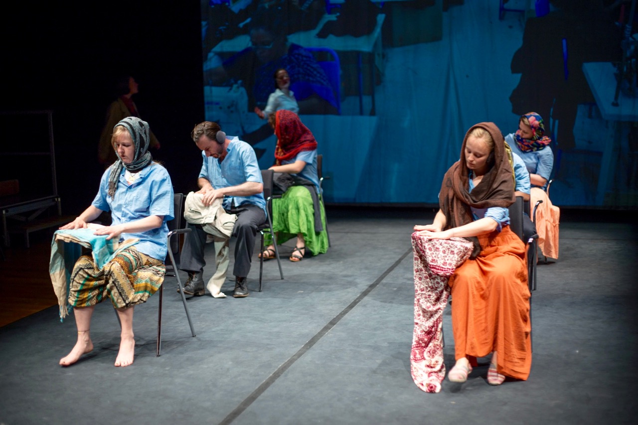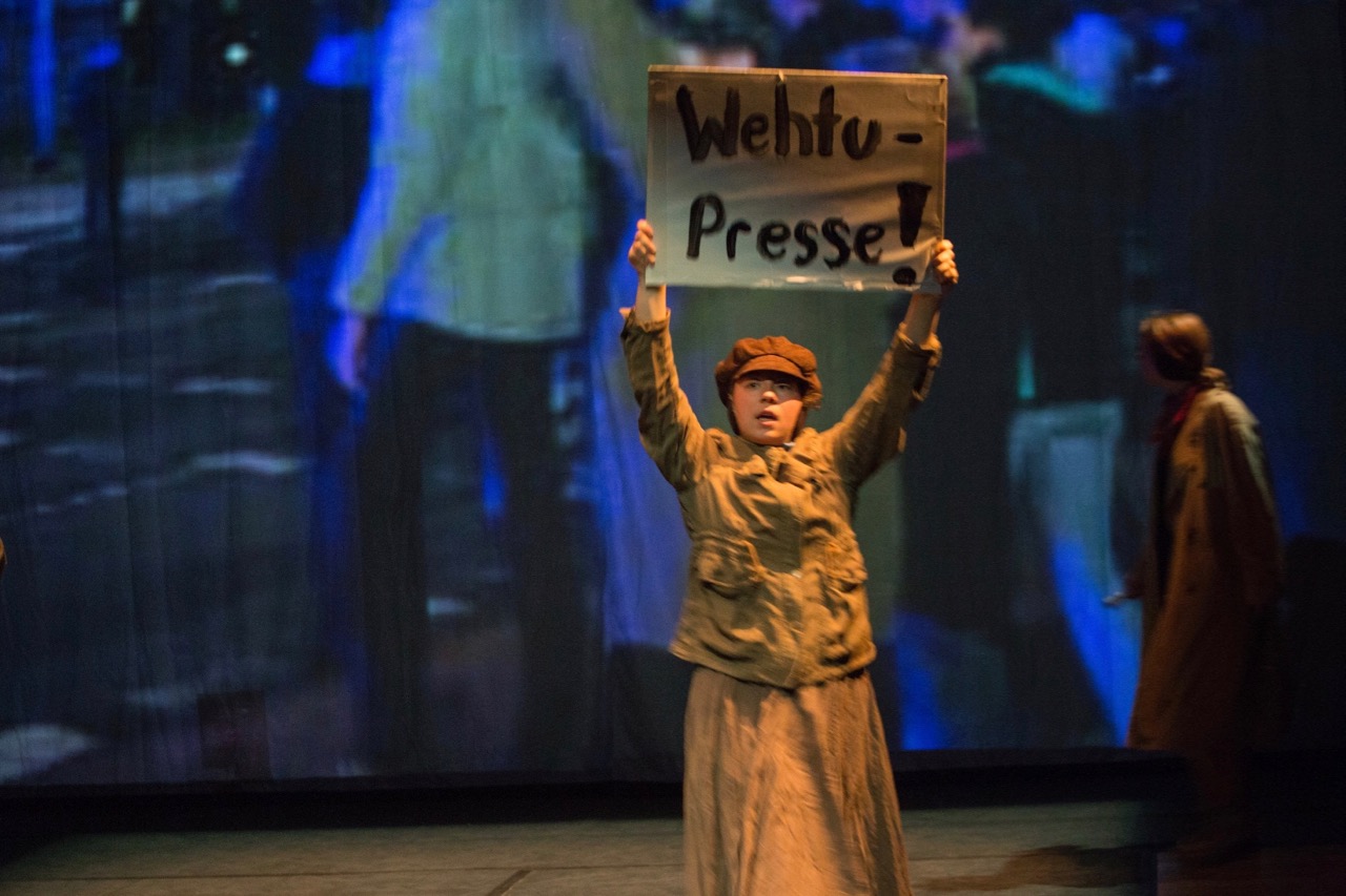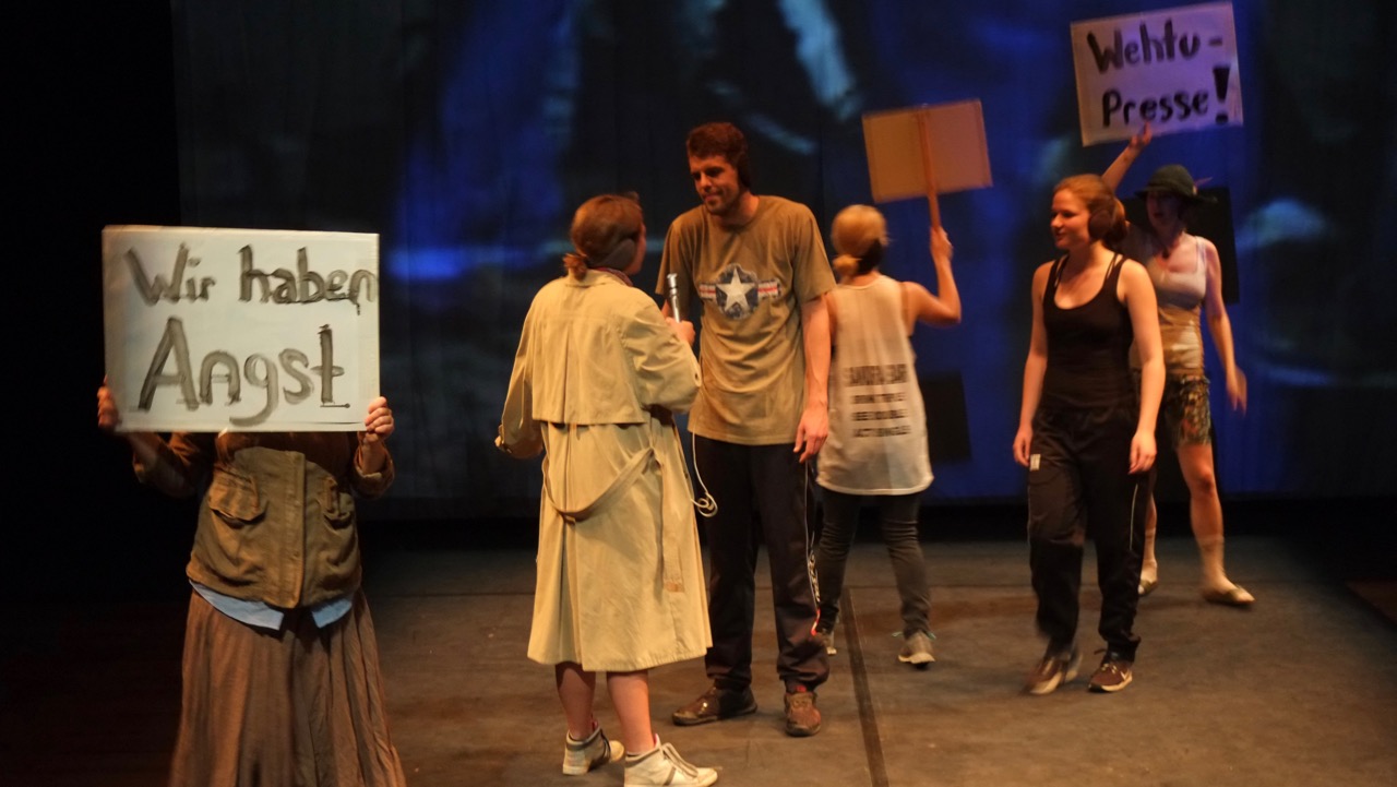 Stanislaw Lem spielte einst spitzfindig auf die Missstände in der Sowjetunion an. Kurt Raster holt die Geschichte in die Moderne, mit Zitaten und Collagen. Demonstranten marschieren auf, während im Hintergrund Bilder von Anschlägen auf Asylheime aufflackern. Und in der Nähfabrik zitiert die Vorarbeiterin aus den Richtlinien des umstrittenen Textil-Discounters Kik.