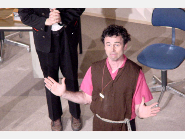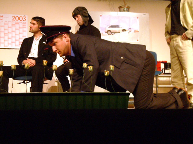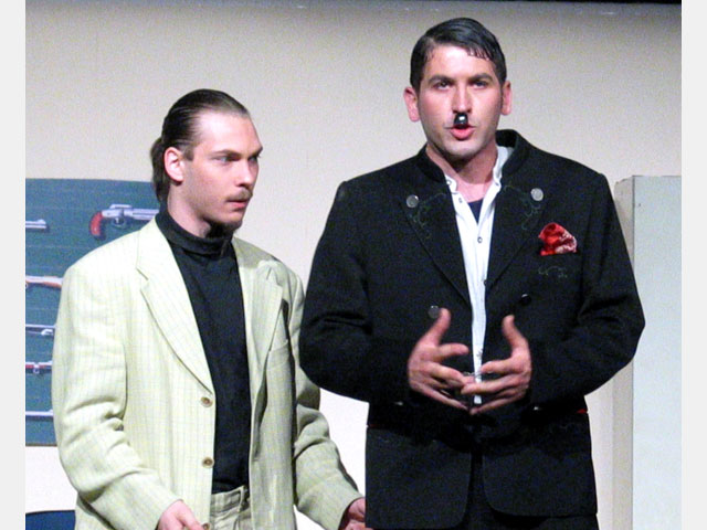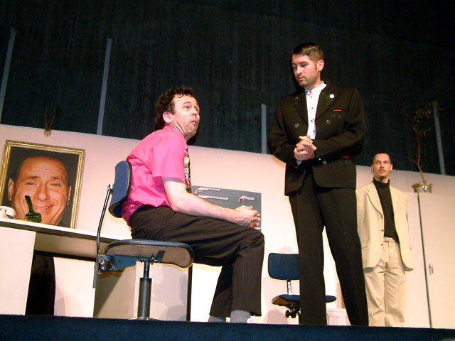Regensburg. Die Leute vom ueTheater haben wohl gemerkt, daß die Terrorismus-Debatte der 70er nicht mehr nahtlos auf die heutige Situation paßt. Damals stellte sich die Staatsmacht unter dem Argwohn der Linken massiv auf die Hinterbeine und nahm es mit dem Recht nicht immer sonderlich ernst. Dario Fo schrieb sein Stück "Zufälliger Tod eines Anarchisten", nachdem in Mailand der eines Sprengstoff-Attentats verdächtige Eisenbahner Pinelli aus ungeklärten Gründen aus dem Fenster des Polizeipräsidiums zu Tode gestürzt war. Seine Unschuld stellte sich hinterher heraus, es kam der Verdacht auf, die Polizei habe ihn aus dem Fenster gekippt.