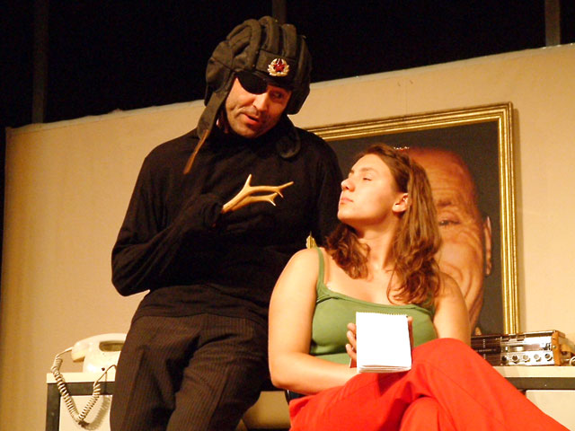 Die Schauspieler bereiten alles für die Journalistin vor. Stuhl an die Tür, Pornokalender runter, Folterwerkzeuge weg. Der Verrückte verkleidet sich als Kriegsveteran. Maxl und Kasperl beobachten das Treiben und setzen sich dann vorne an den Bühnenrand.