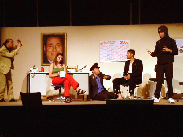 Natürlich mußten Anspielungen auf Berlusconi herhalten, der ja auch weiß, wie man das Recht zu seinen Gunsten beugt. Ein wenig problematisch und übertrieben plakativ scheint mir, daß man den Polizeipräsidenten (Frank Schmid) zu einer unkaschierten Hitlerparodie stilisiert. Da haben die jungen Leute wohl noch nicht ganz begriffen, daß der Gröfaz ein Unikum war, das man nicht leichtfertig und inflatorisch herbei zitieren sollte. Die Live-Musik hat Kurt Raster geschrieben.
