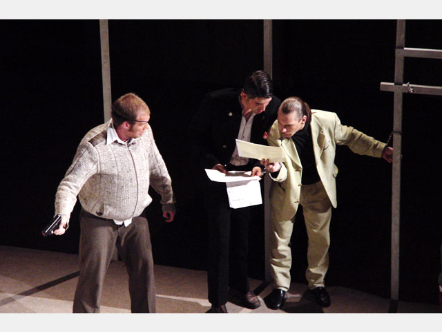 Dario Fo, der linke Spaßmacher, der mittlerweile den Literaturnobelpreis bekommen hat, packte seinen Kommentar zu dem Fall in eine Sarkastische Groteske, wobei er Anleihen bei der Comedia dell`Arte nicht scheute. Die Regensburger haben noch eins draufgesetzt, indem sie das Ganze in das Flair eines Kasperltheaters tauchten. Die erste Szene spielt komplett auf einer Rampe, wie man sie von Puppenbühnen kennt. Nur die Oberkörper sind zu sehen. Die Darsteller agieren ruckartig und übertrieben wie das Personal der Kinderbühne. Damit erreicht man eine Distanz zum Realismus, der 1970 noch berechtigt gewesen sein mag.